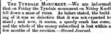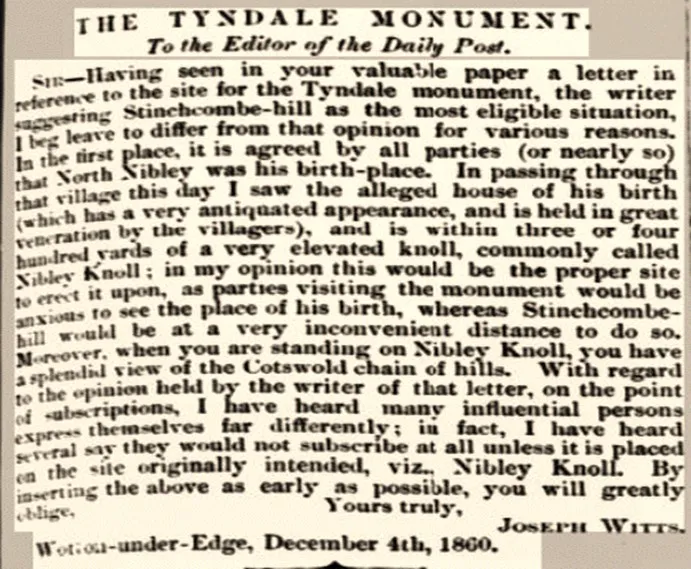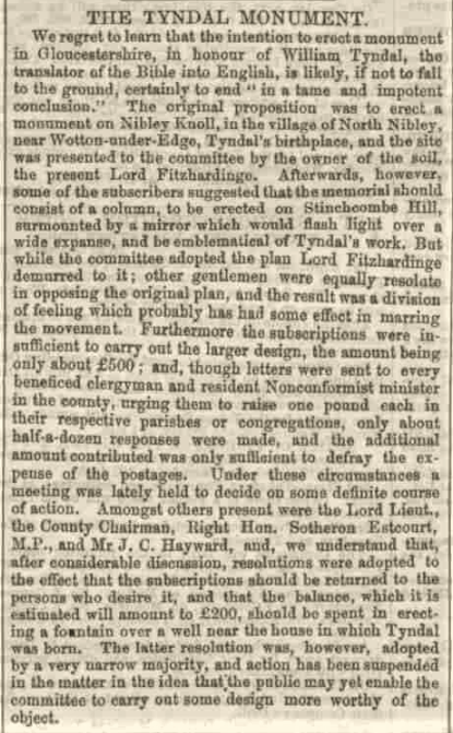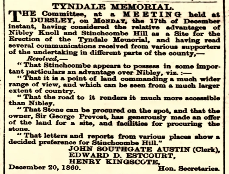 Sir, – We desire to thank you for having opened the columns of your journal on several occasions to ourselves and others advocating the erection of some suitable memorial to Wm. Tyndale. We now wish to call attention to the definite resolution passed at a meeting of the committee held in Wotton-under-edge, on the 10th Inst. That resolution determines Nibley Knoll (the site originally offered to the committee by Lord Fitzhardinge) as that which under all the circumstances is the best. The height and magnitude of Stinchcombe Hill, admirably suited as it is no doubt is for such an object, would have necessitated a proportionate erection, in order that an effect might be produced throughout the surrounding vale and district. Nor do the contributions already placed at the disposal of the committee warrant them in thinking that the very large sum which so lofty a shaft would cost, could be readily raised. Added to this, Stinchcombe having been set apart as a rifle shooting ground, free access to the memorial must have been refused to the public on many days.