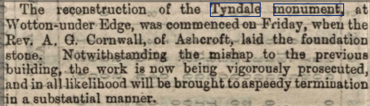 – Earl Ducie proposes that the column to be erected to the memory of Tyndale should be surmounted by a parabolic reflector or mirror of some kind which might be so constructed as to reflect the sun’s rays through a large angle, and be visible at a great distance, across the Severn, and up and down the line of the Midland Railway. “This reflector would” it is said “have a beautiful effect during many hours of the morning and evening in summer, and throughout the whole period of sunshine on a winter’s day, and would strikingly illustrate the great event of Tyndale’s life which it is proposed to commemorate.” – Builder